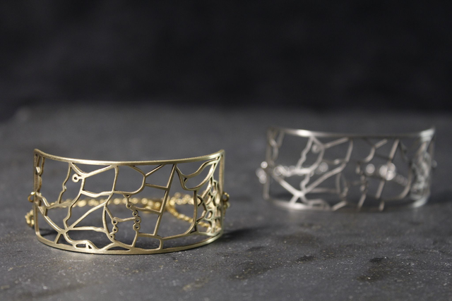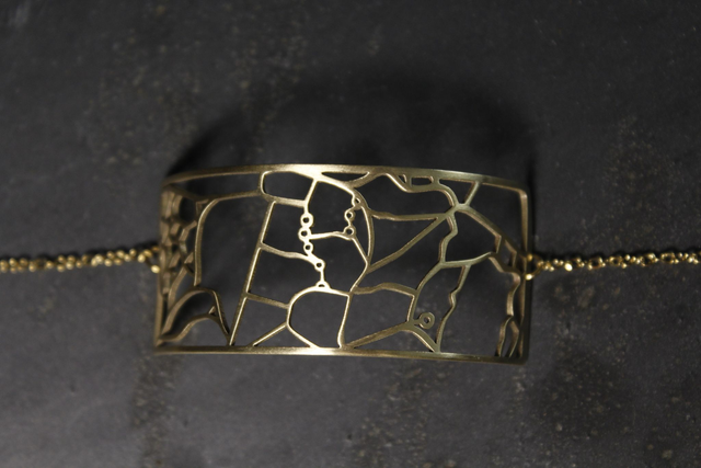 Ce bracelet cartographique de forme rectangulaire illustre un fragment de la carte de Genève, centrée sur le Parc botanique. Fabriqué en laiton doré, une matière délicate et chaleureuse, il nécessite un entretien léger deux fois par an pour conserver son éclat.