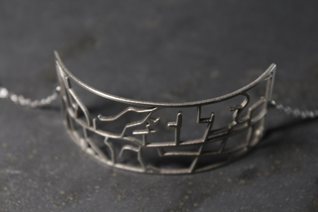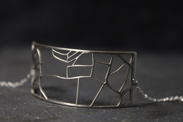 Ce bracelet cartographique de forme rectangulaire illustre un fragment de la carte de Lausanne, centre sur Quartier du Flon. Fabriqué en acier inoxydable argenté, ce bijou contemporain ne nécessite aucun entretien.