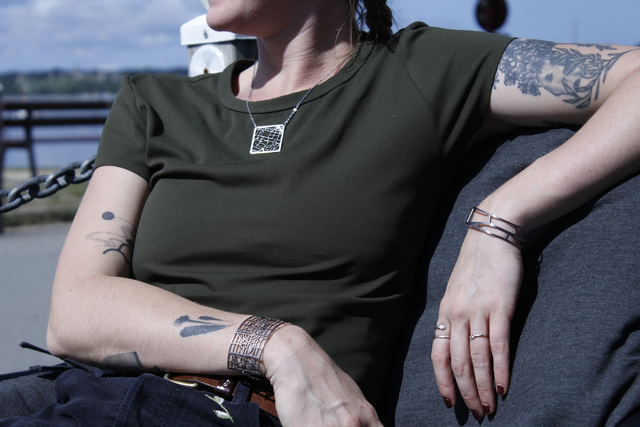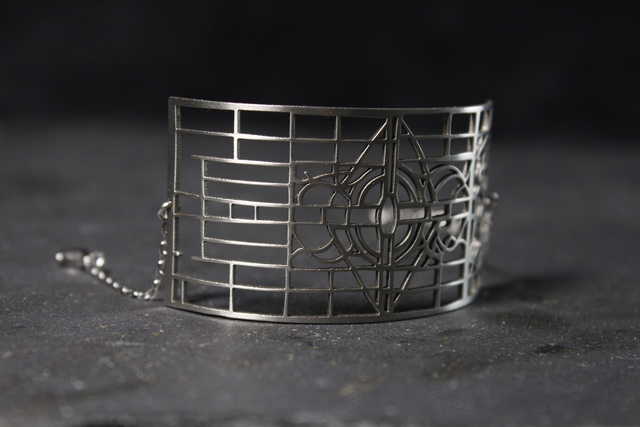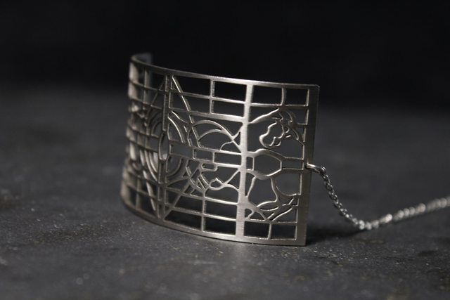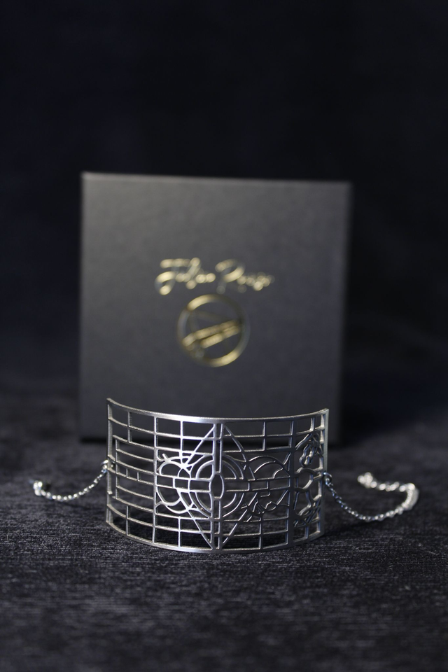 Ce bracelet cartographique de forme rectangulaire représente un fragment de la carte de Paris, centré sur le Champ de Mars. Fabriqué en acier inoxydable argenté, ce bijou contemporain ne nécessite aucun entretien.