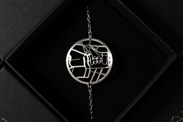 Ce bracelet cartographique de forme ronde représente un fragment de la carte de Paris, centré sur Montmartre et plus précisément Sacré-Cœur.