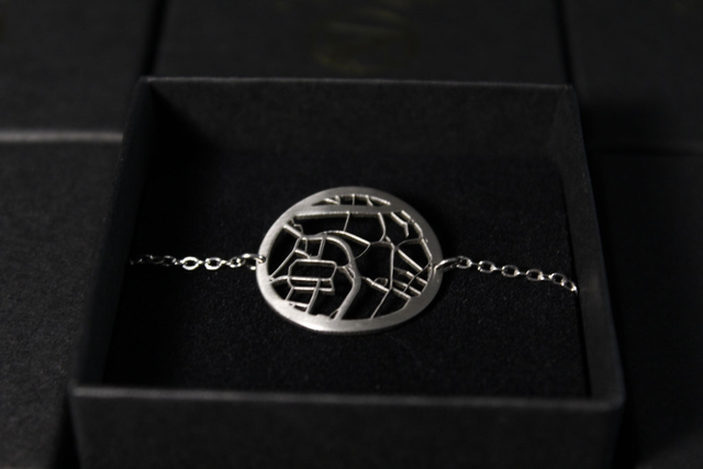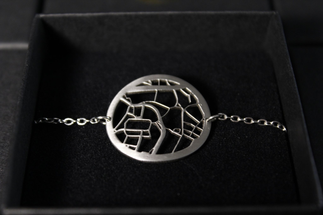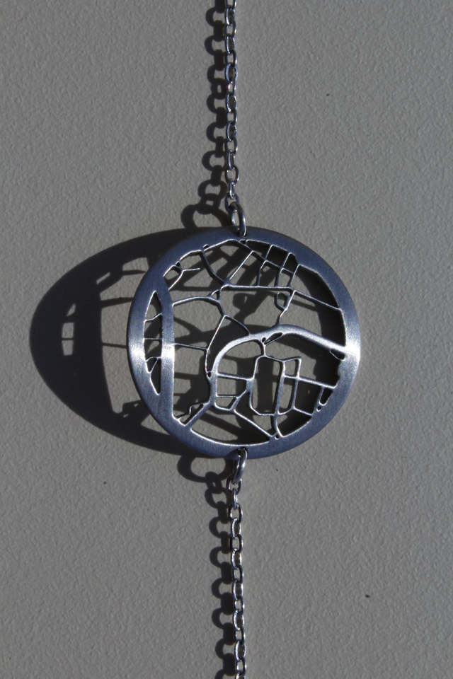 Ce bracelet cartographique de forme ronde illustre un fragment de la carte de Lausanne, centré sur la Vieille ville. Fabriqué en acier inoxydable argenté, ce bijou contemporain ne nécessite aucun entretien.